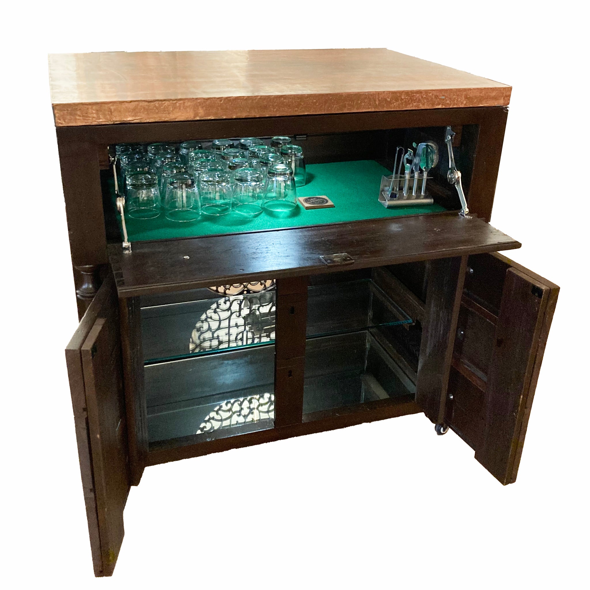 Dave let me steal this solid wood dresser, no veneer! It was converted to a bar with storage. The drawers were turned into doors and a plate glass shelf and mirror were added along with a cast iron grate, wheels, felt and a copper top.