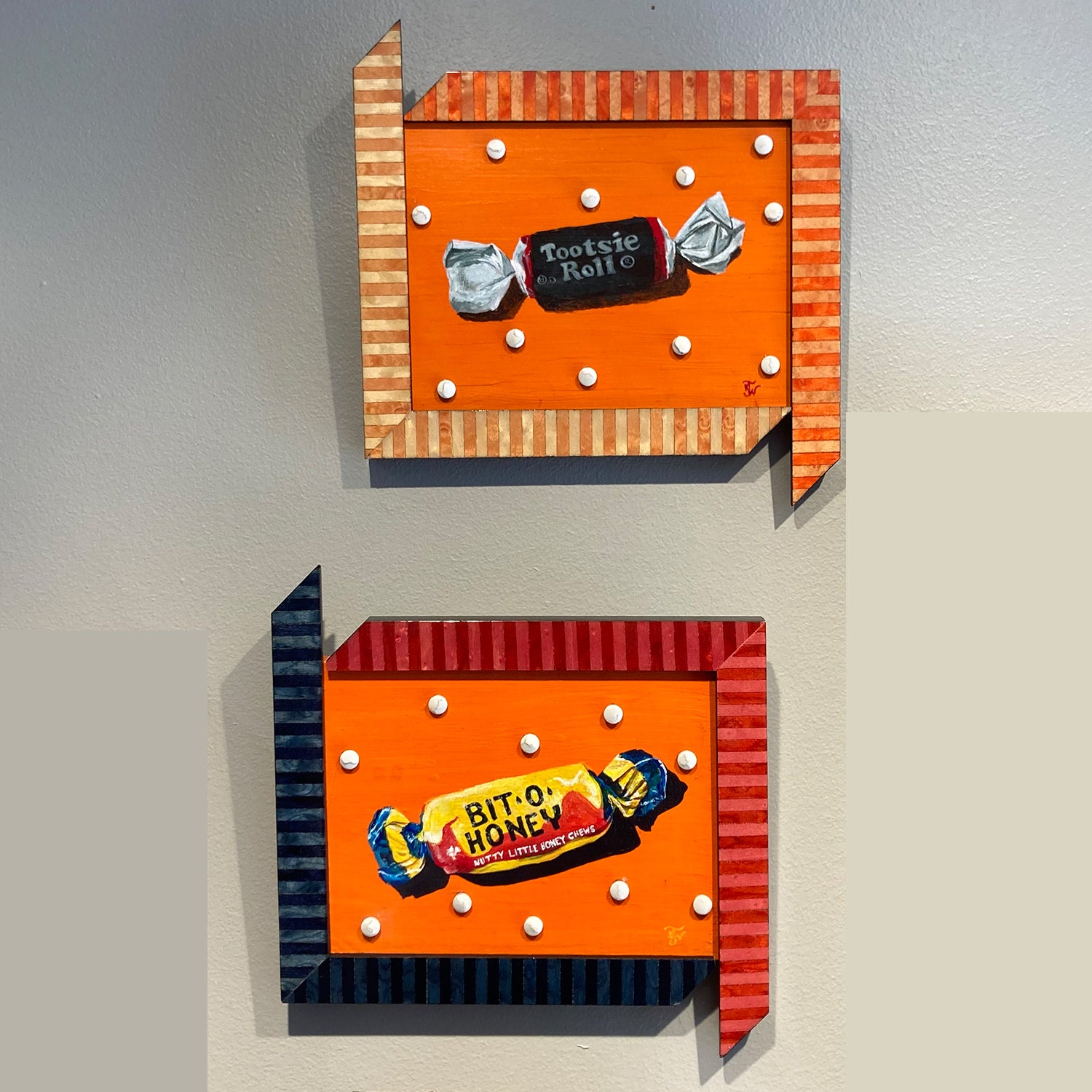 Bit O Honey - acrylic painting on wood with reclaimed framing samples