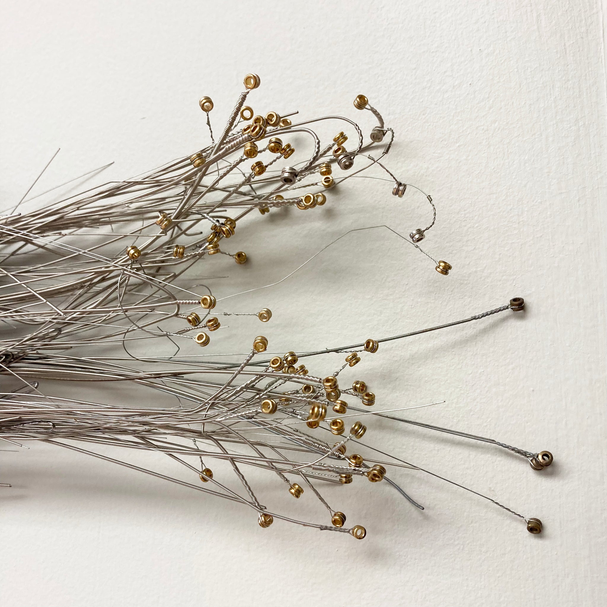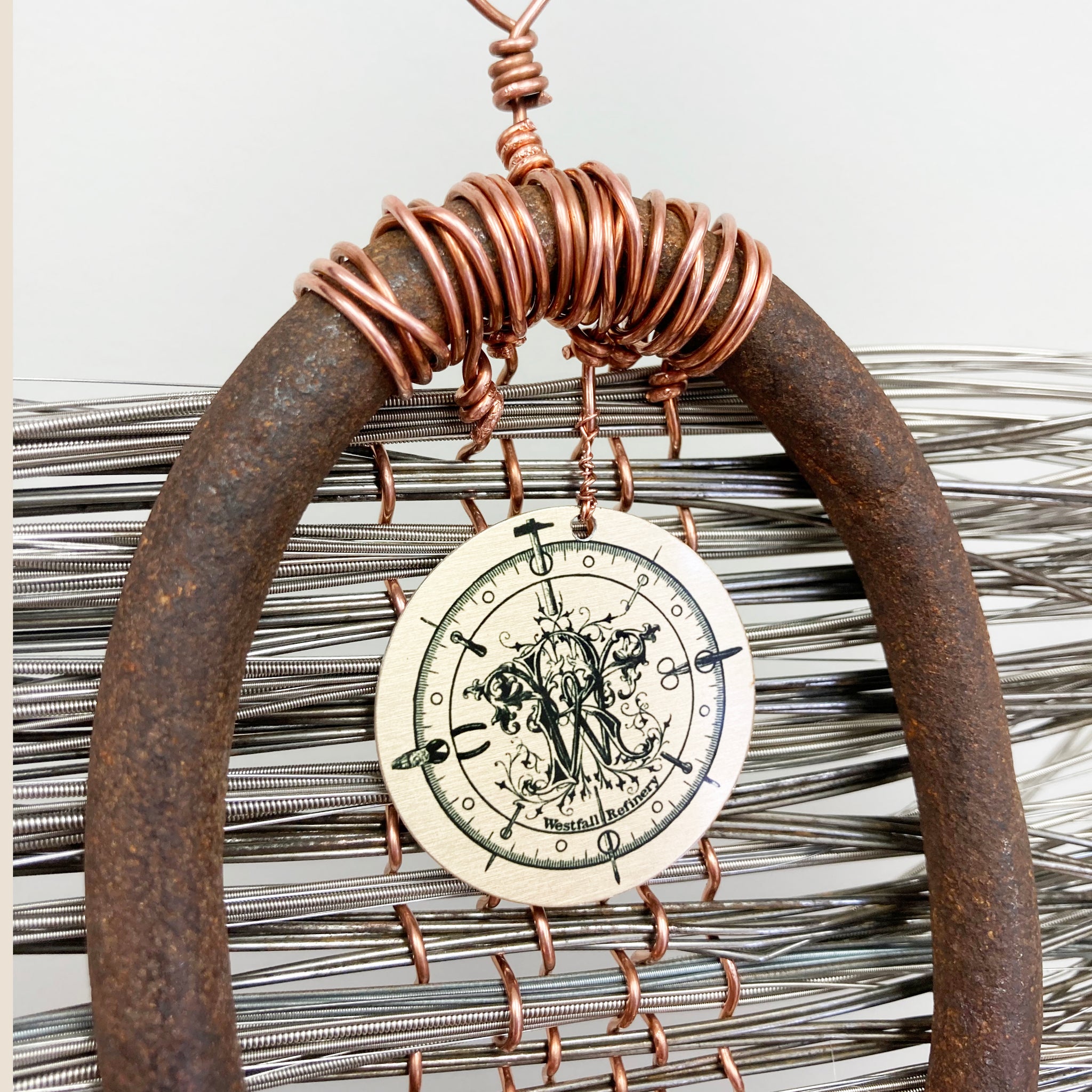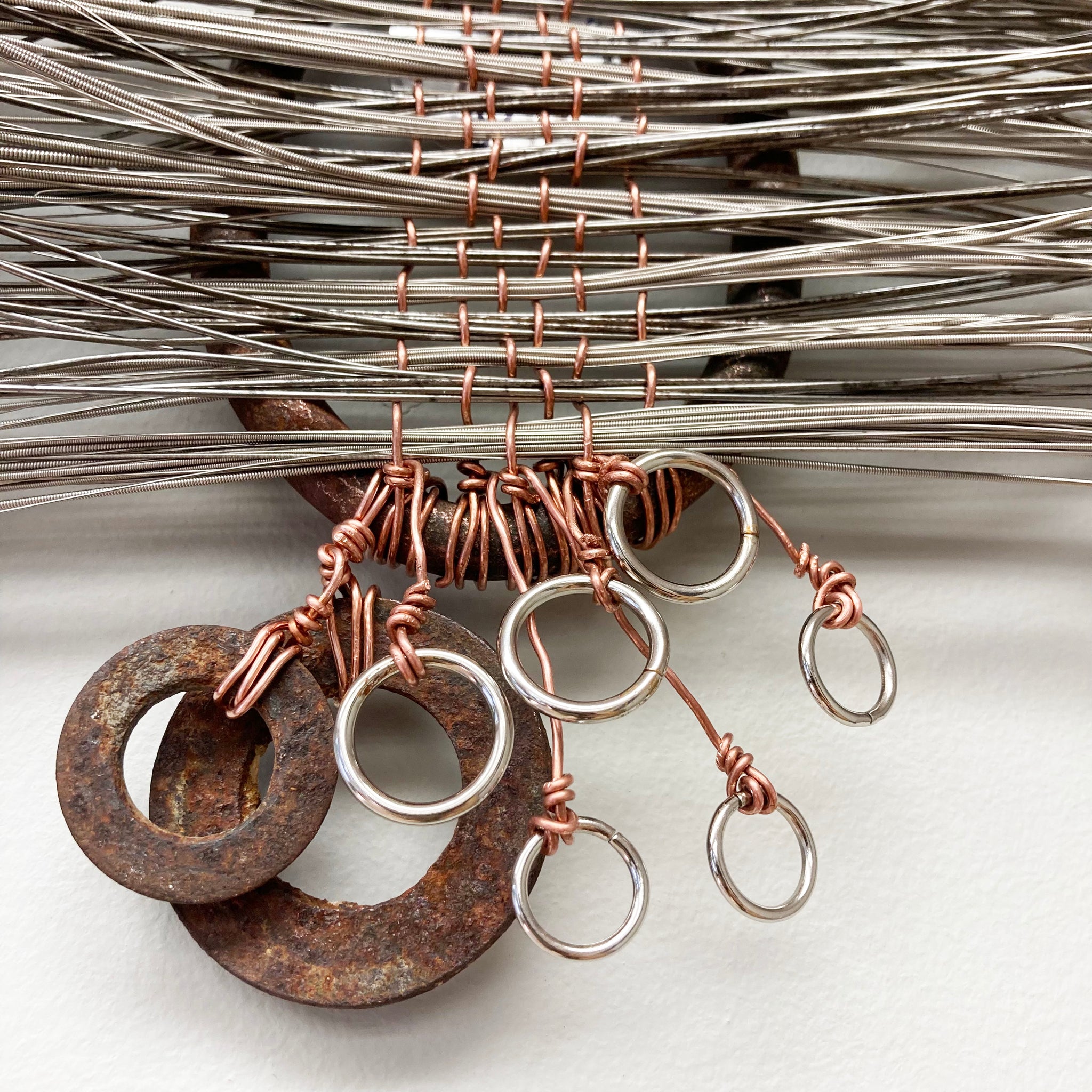 Woven assemblage made with a rusty metal oval, guitar strings, piano wire, washers, jump rings, and reclaimed copper wire.