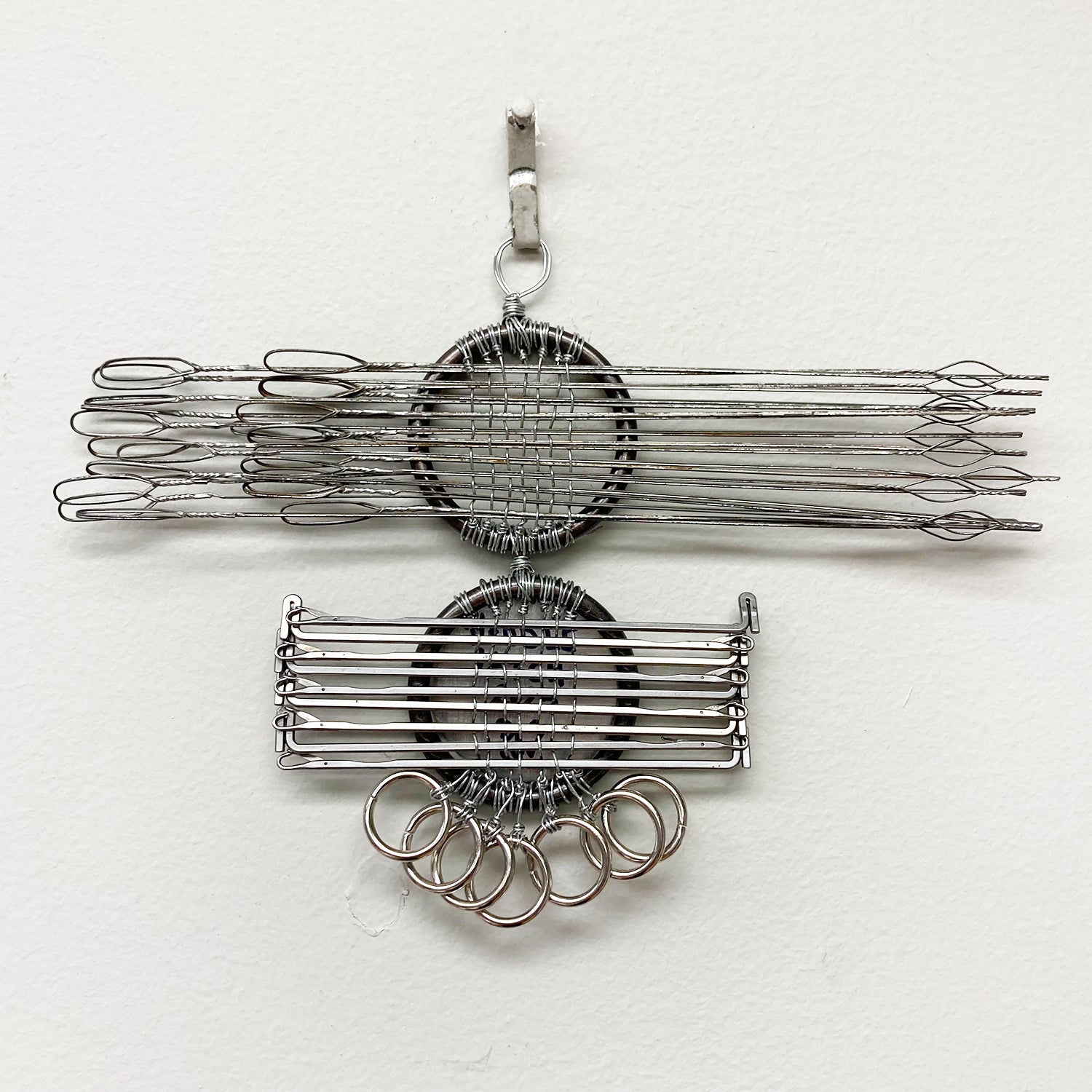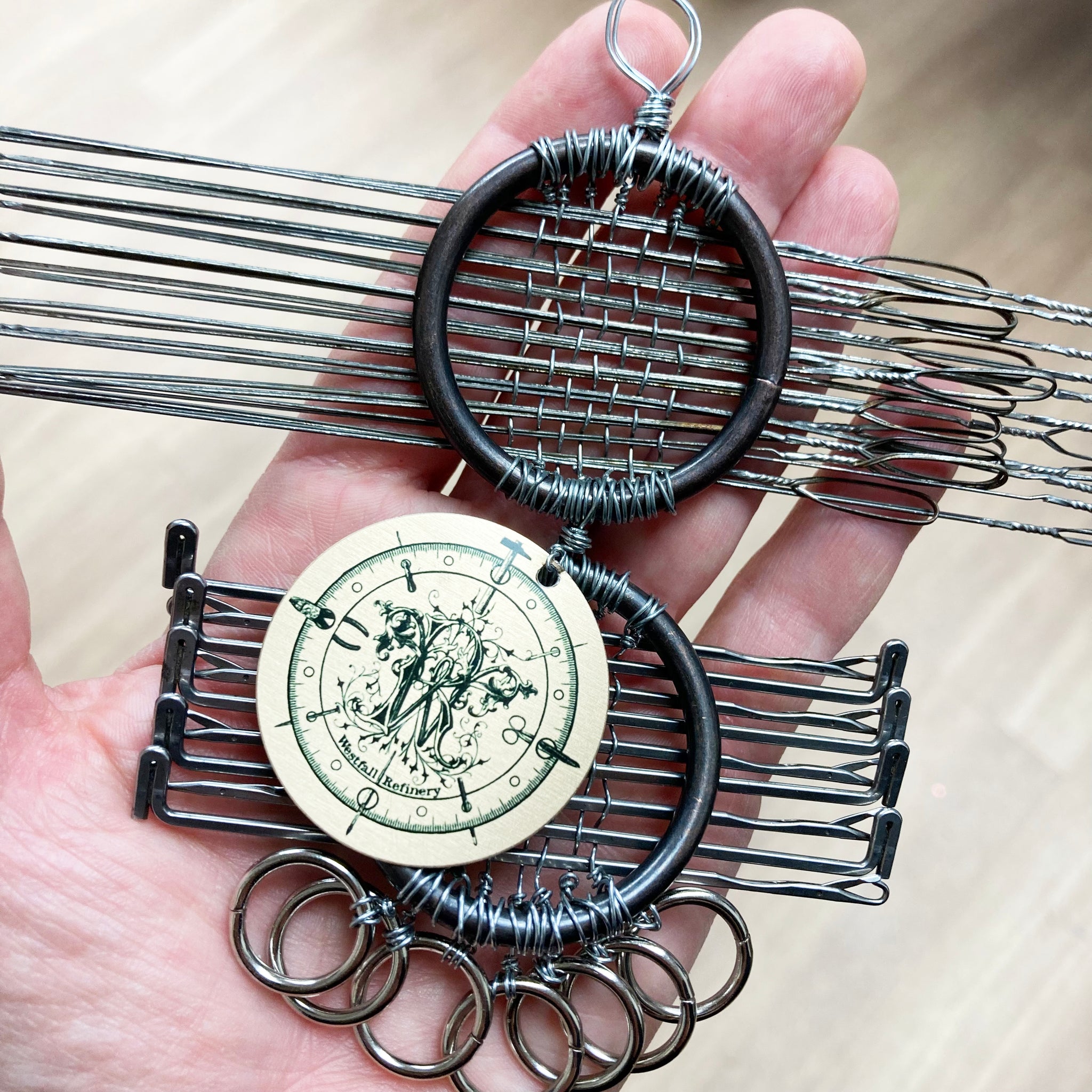Woven assemblage made with curtain rings, weaving loom heddles, knitting machine hooks, jump rings, and wire.