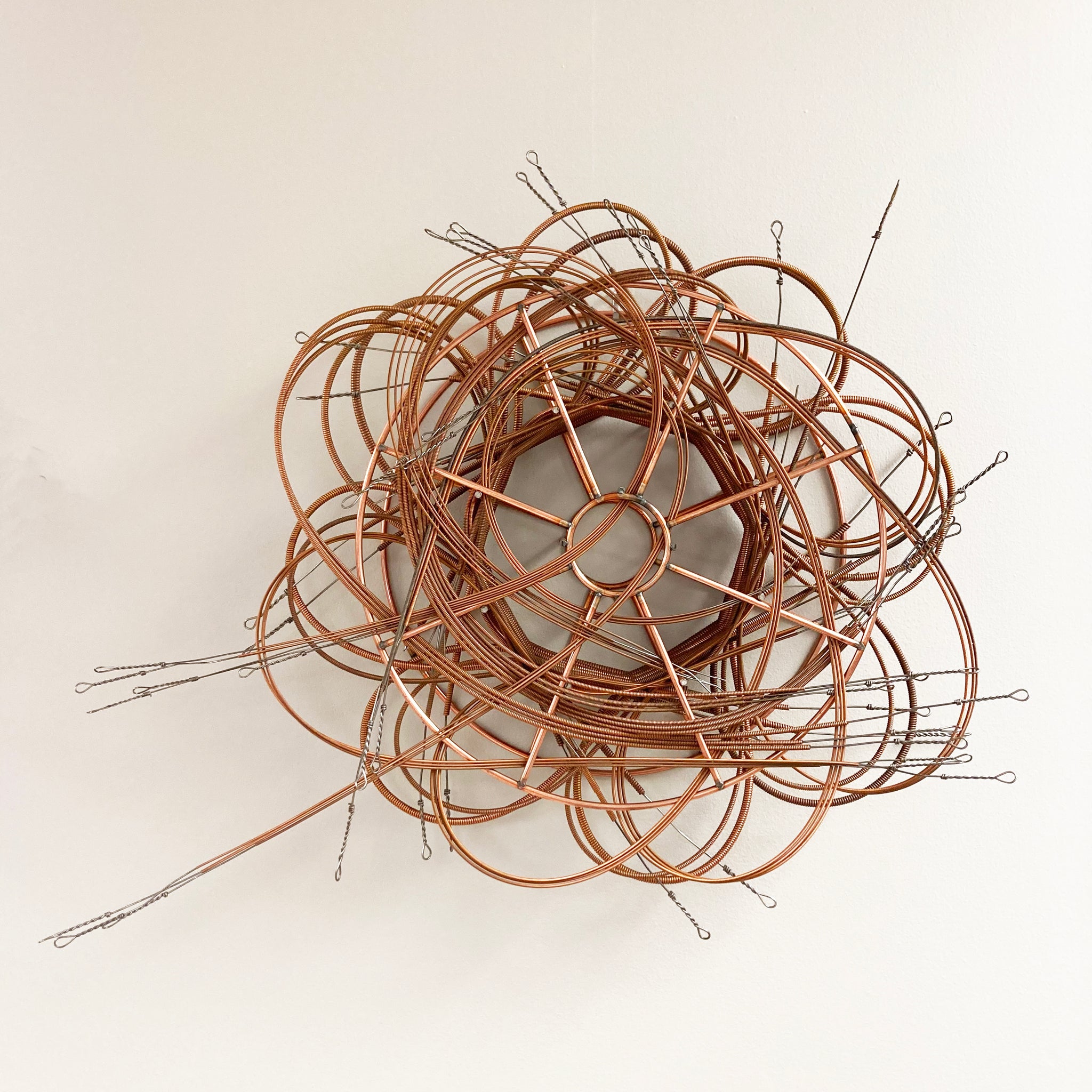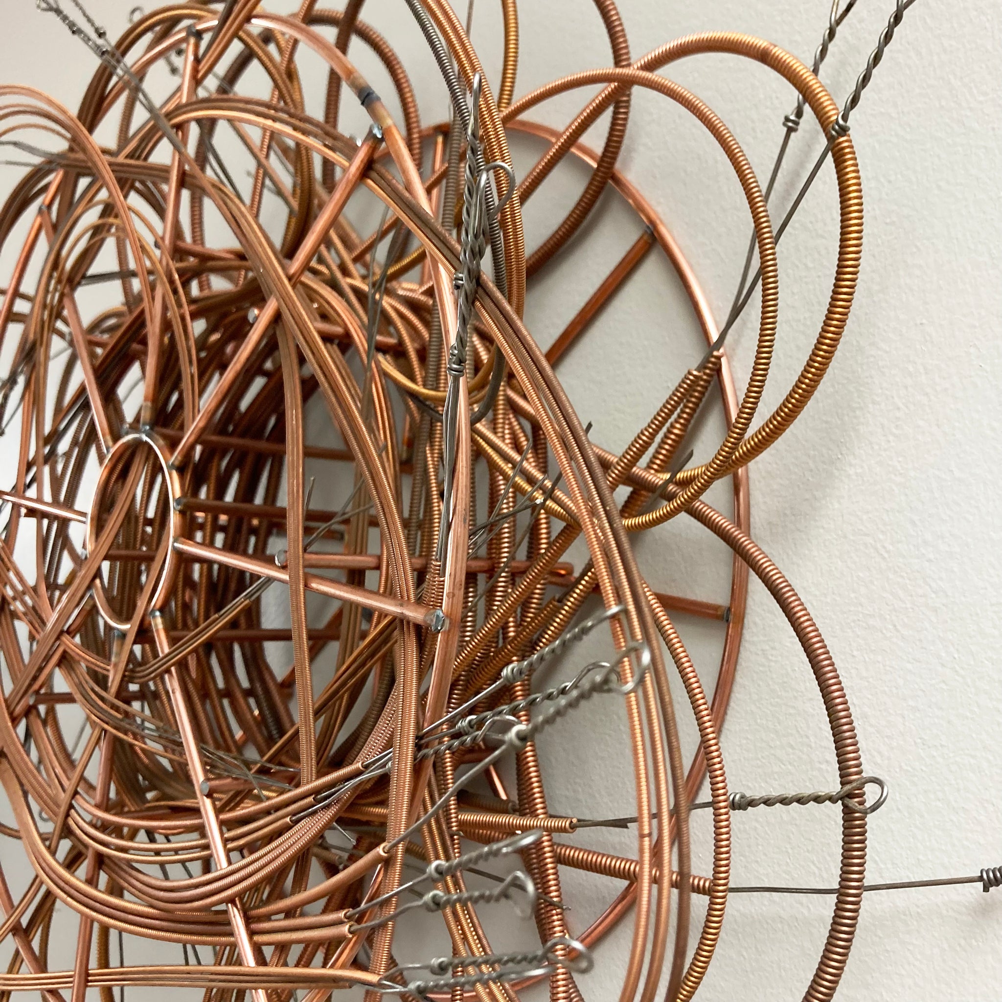 Woven assemblage made with one welding spool and piano strings. Sculpture is held together with the tension of the woven wire - no adhesives or hardware were used in assembly.