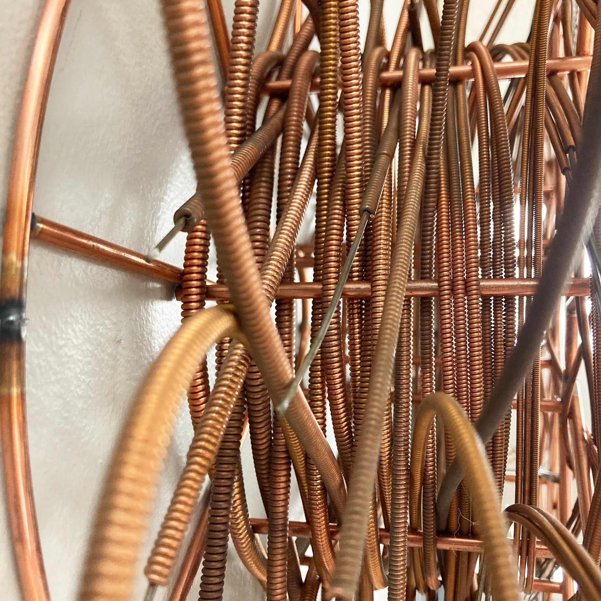 Notice in this piece: Every piano strings loops outside of the spool before re-entering and being woven into place.