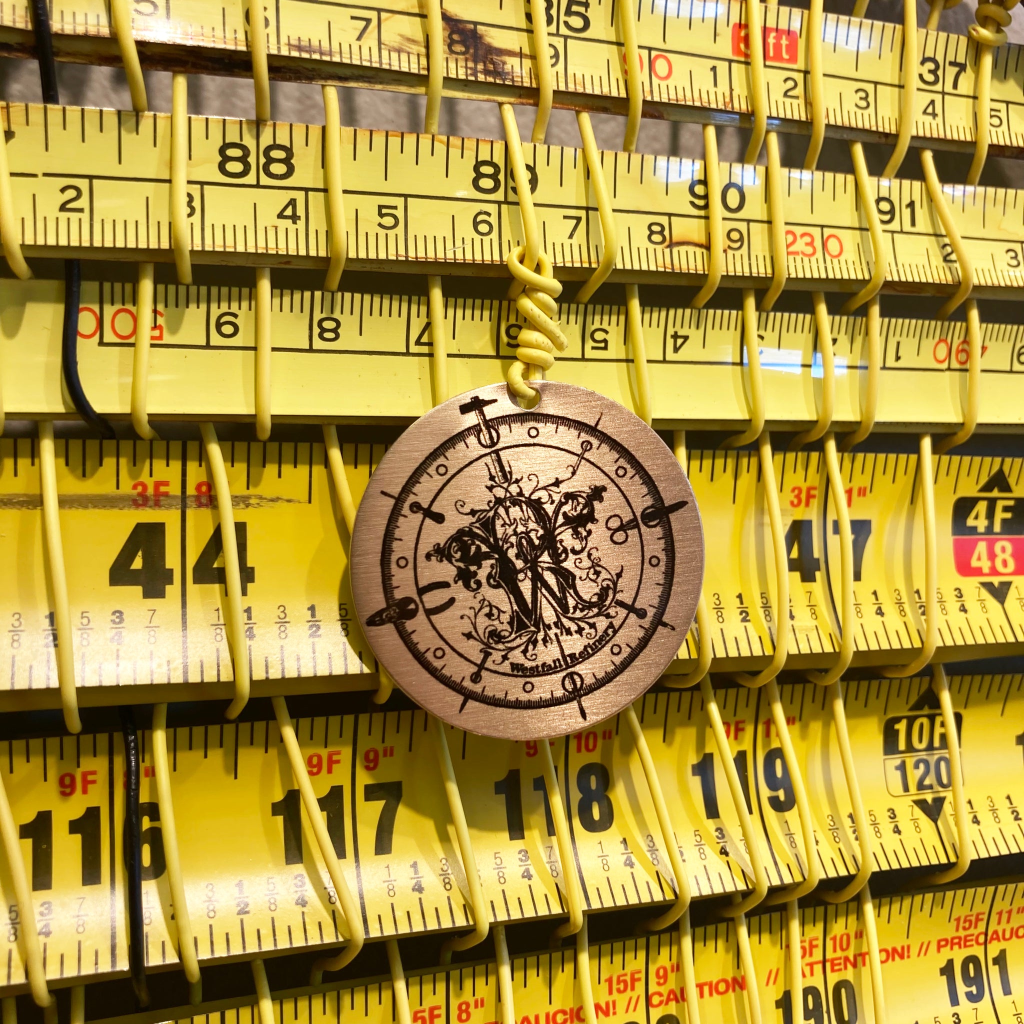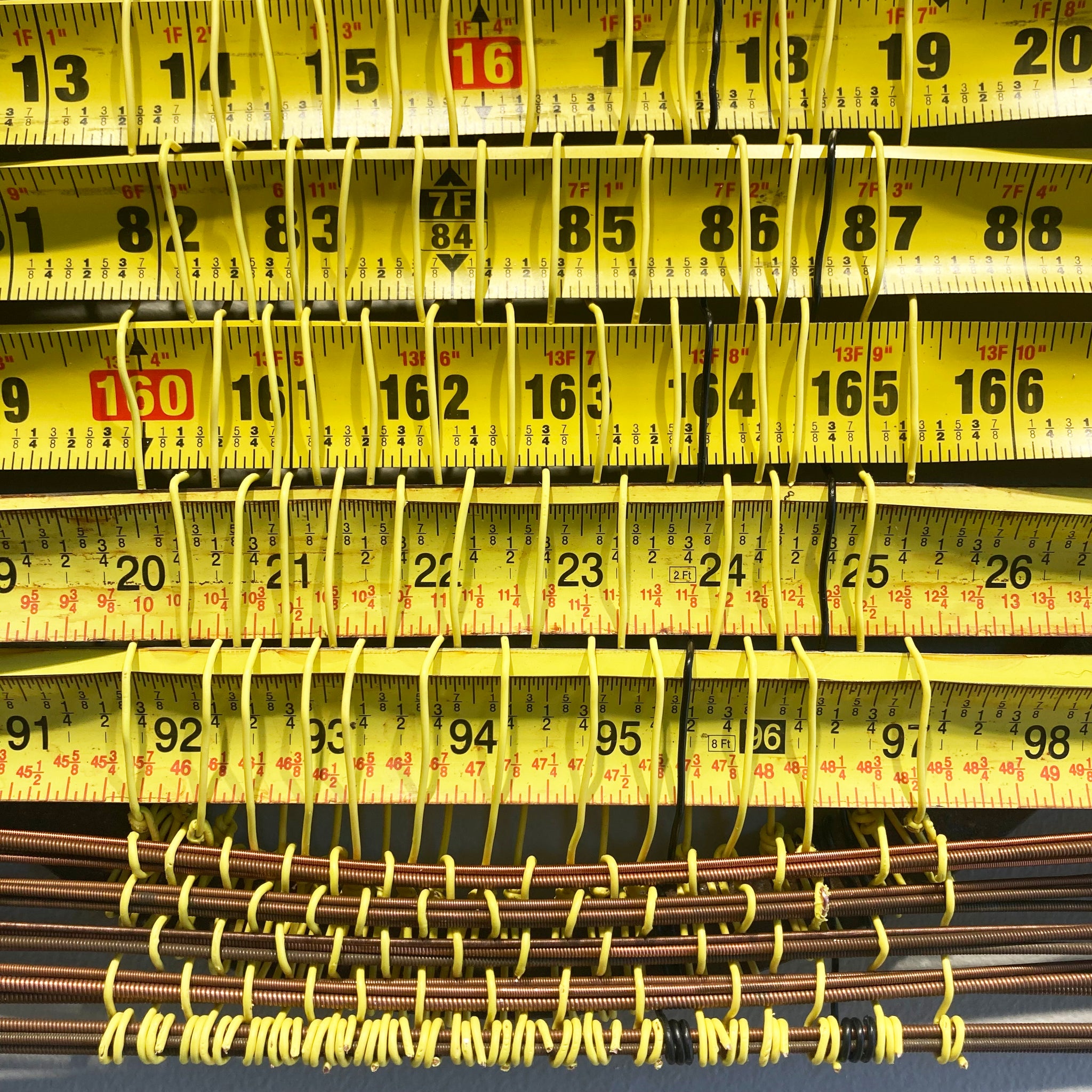 Assemblage made with metal ring, tape measures, piano strings, and telephone wire.