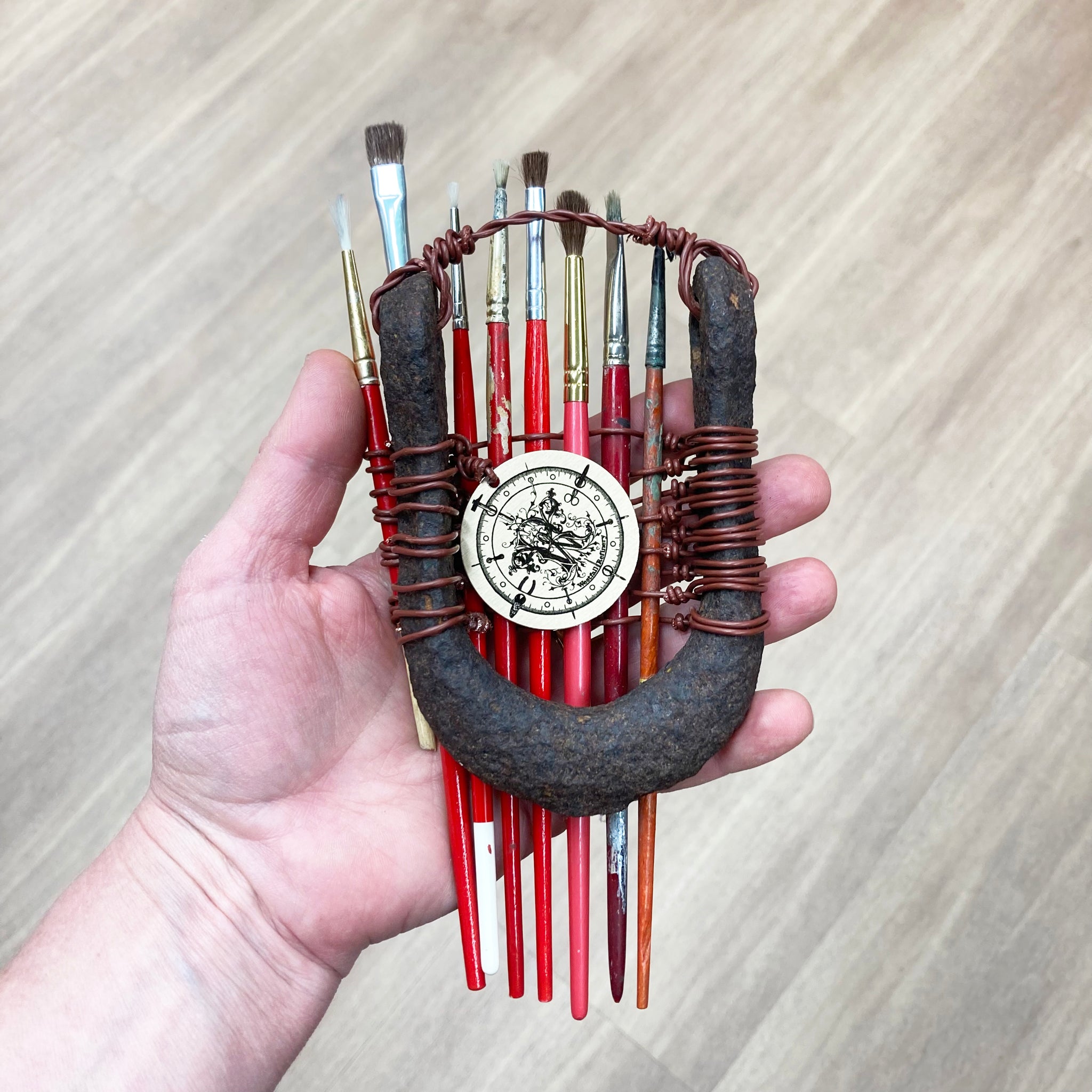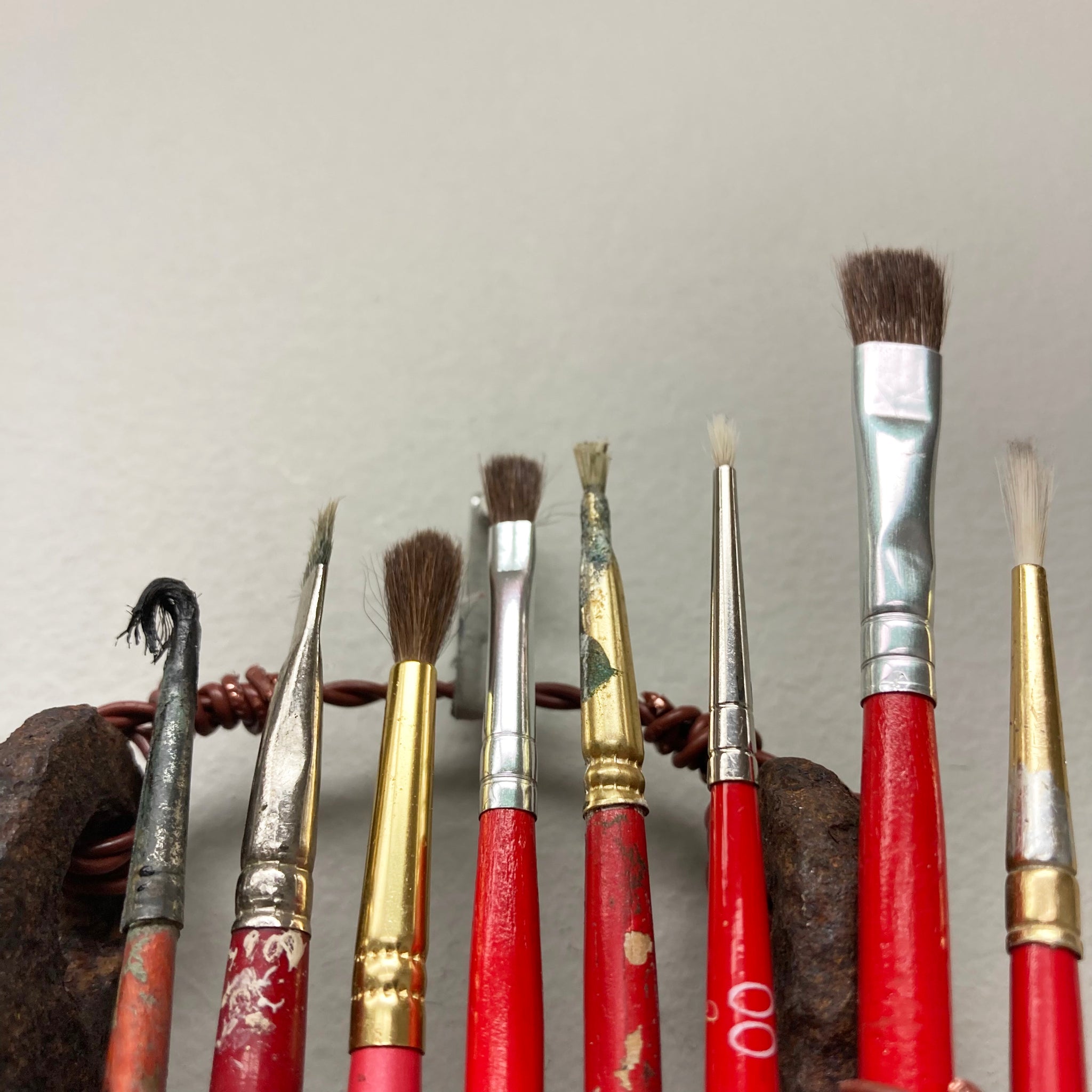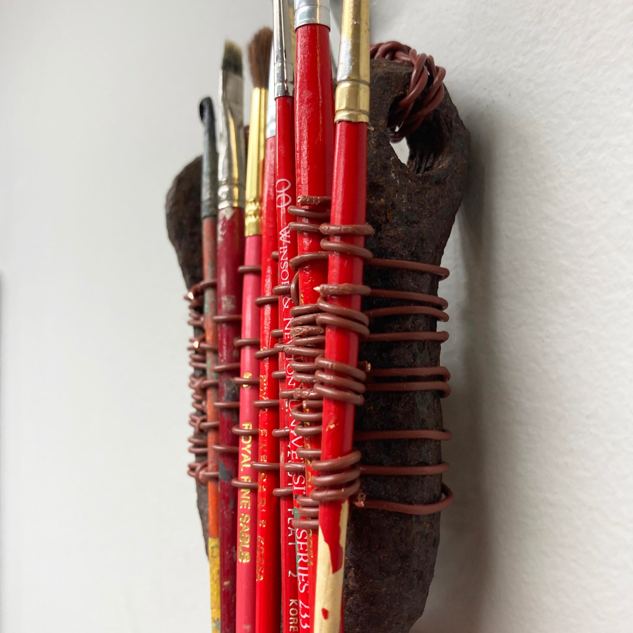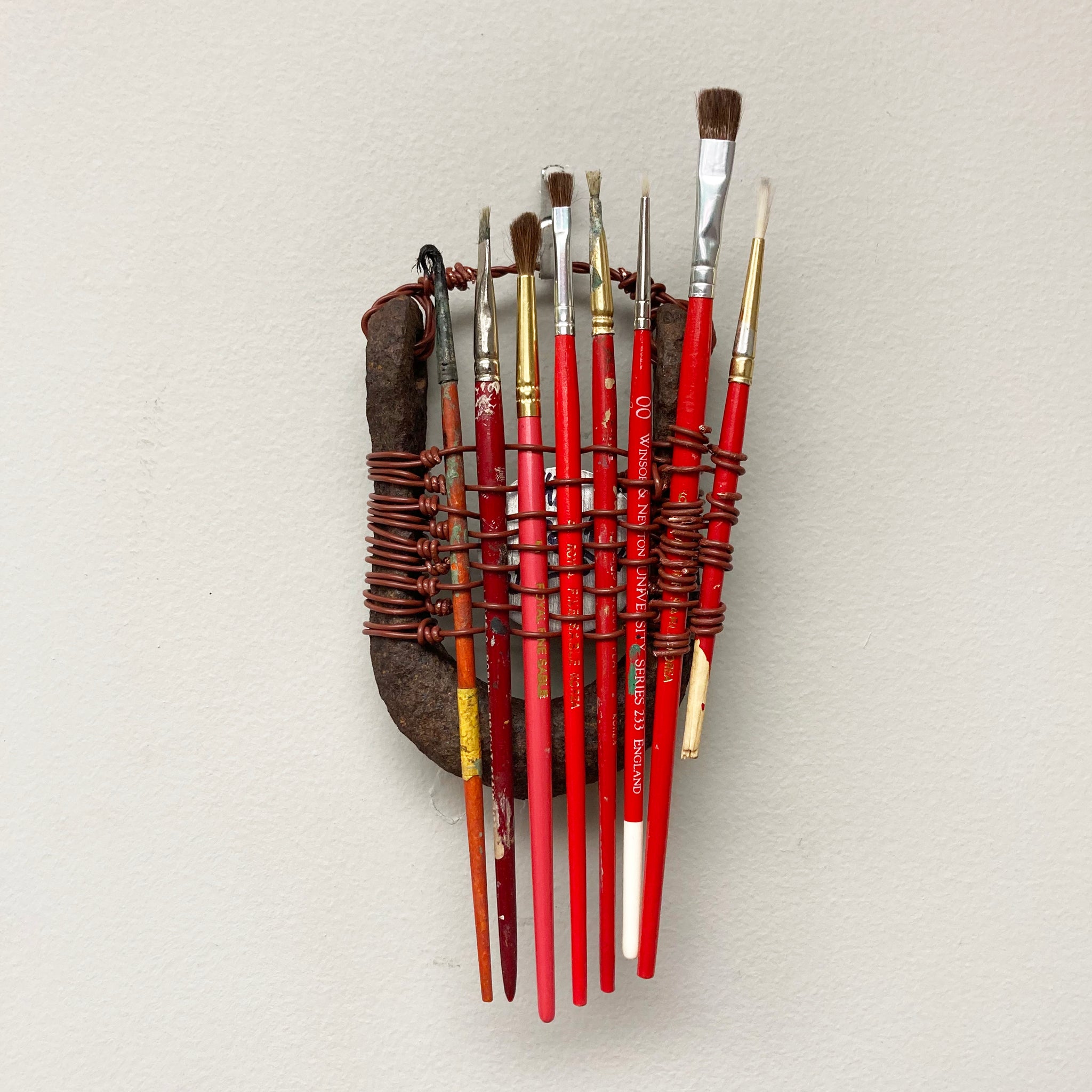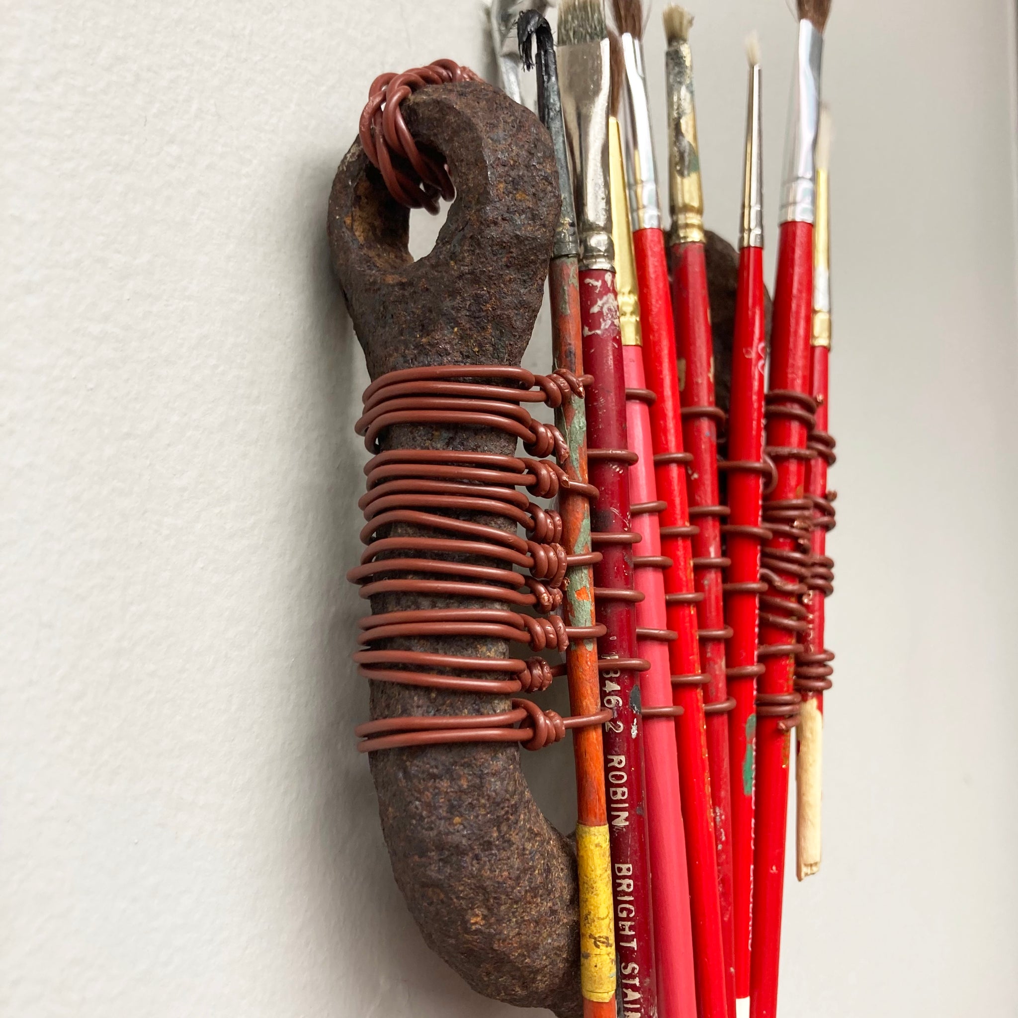 Assemblage made with found metal, paint brushes, and telephone wire.