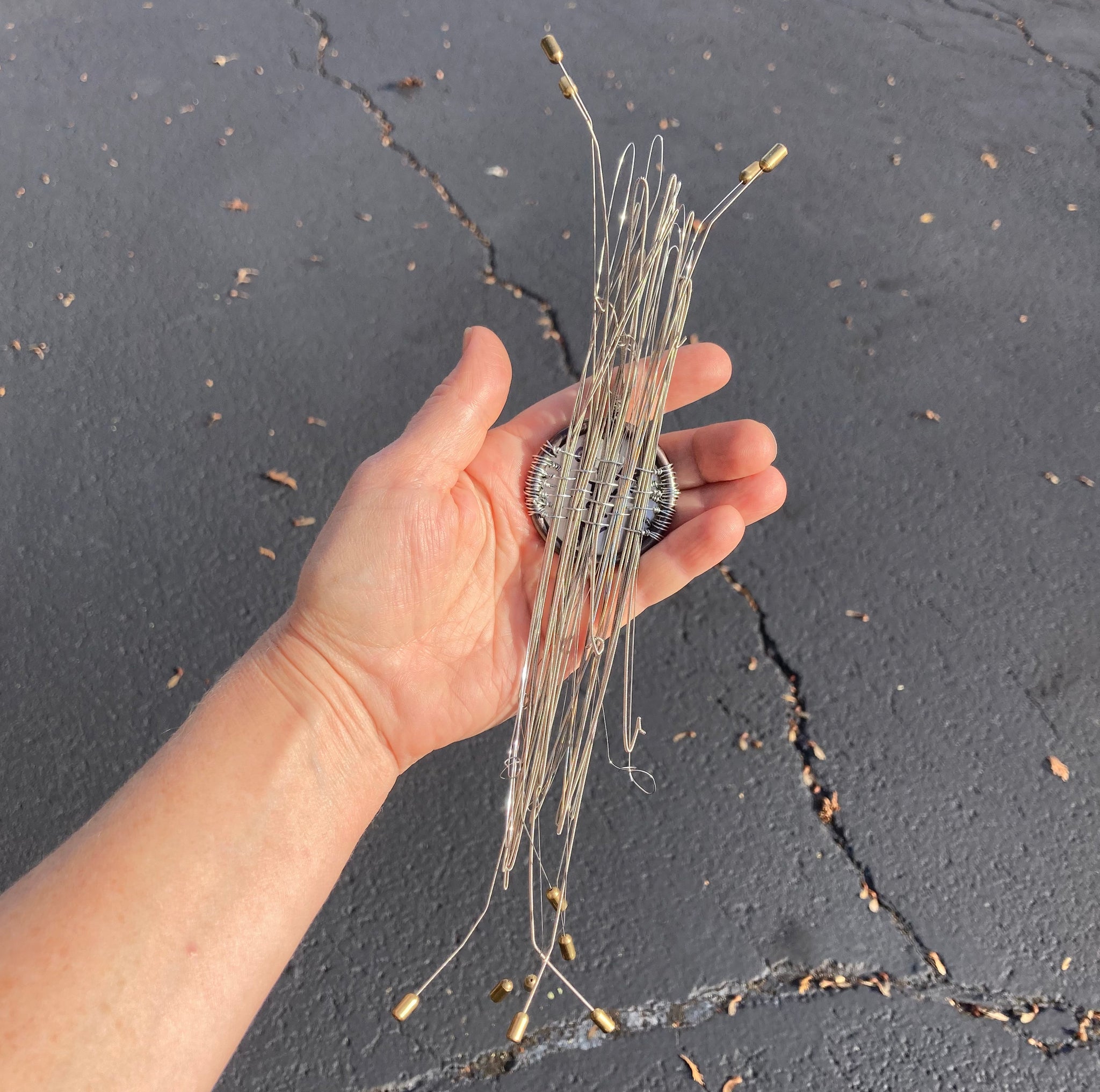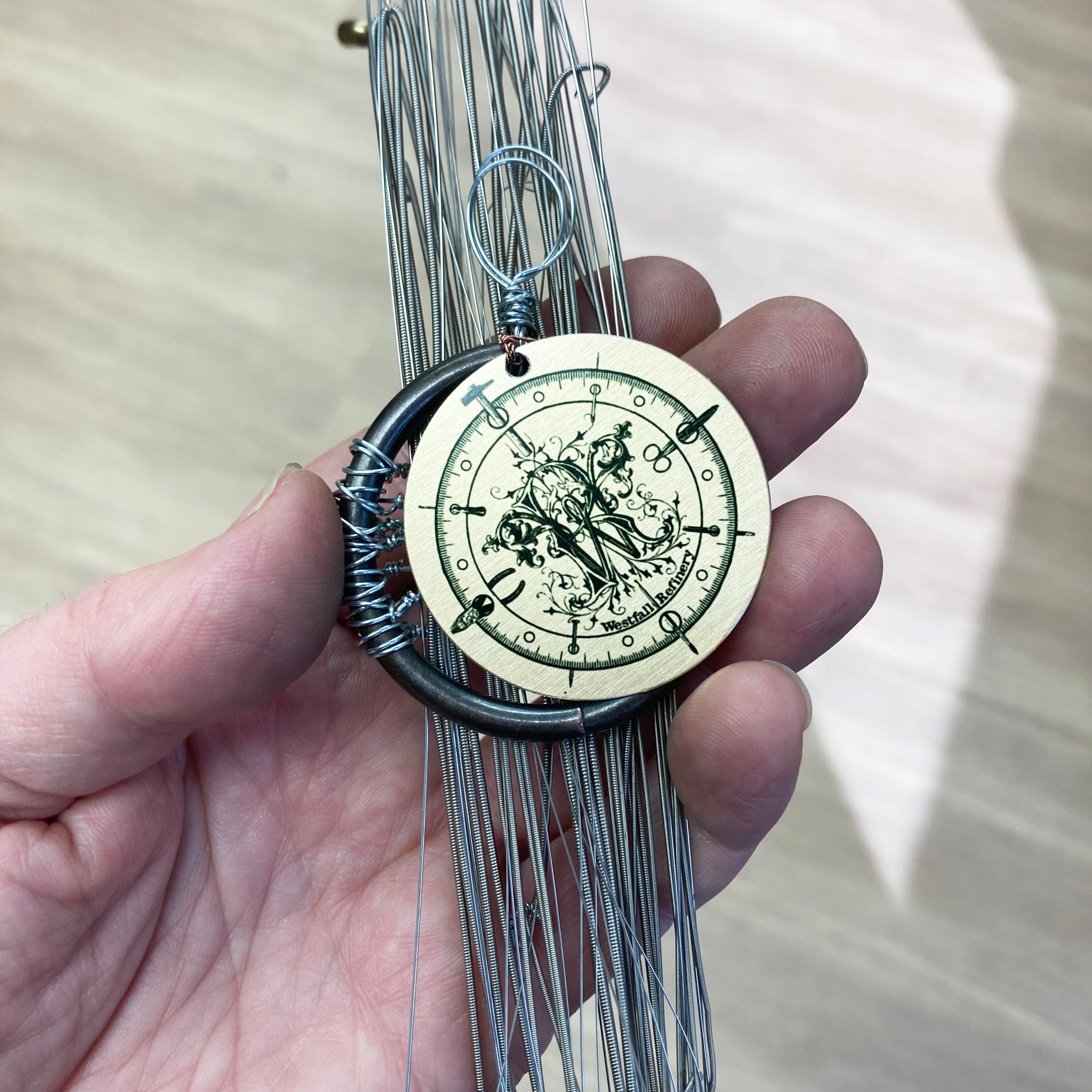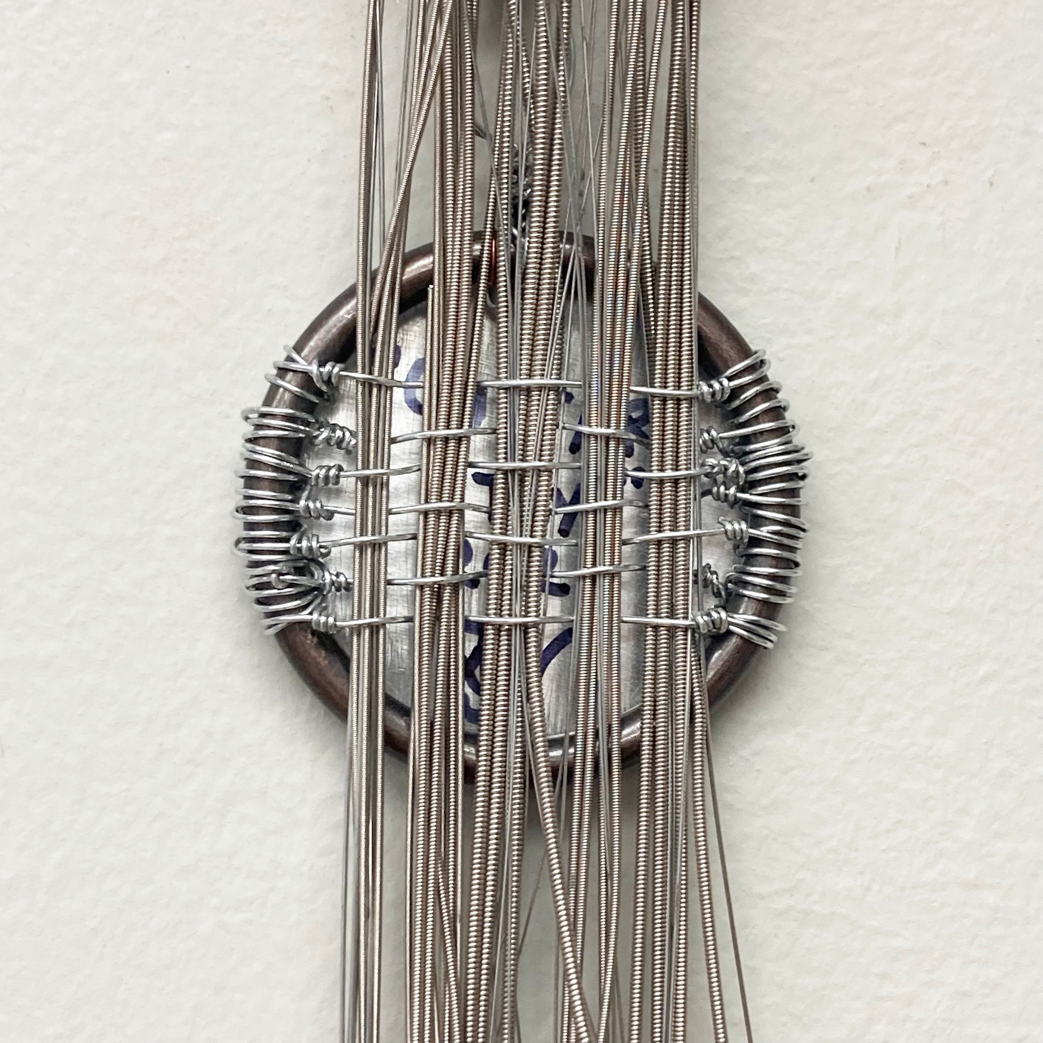 Woven assemblage made with curtain ring, guitar strings, and wire.