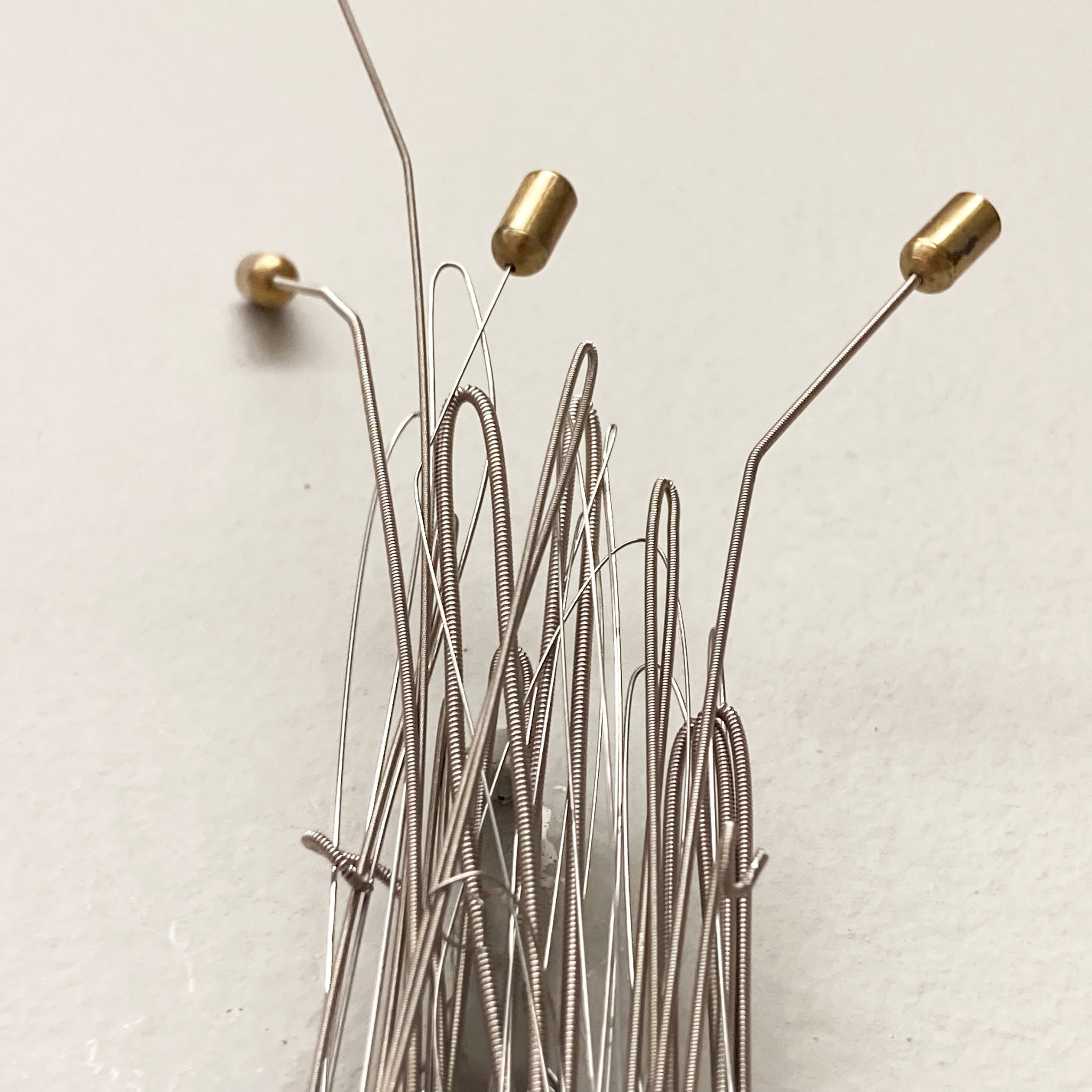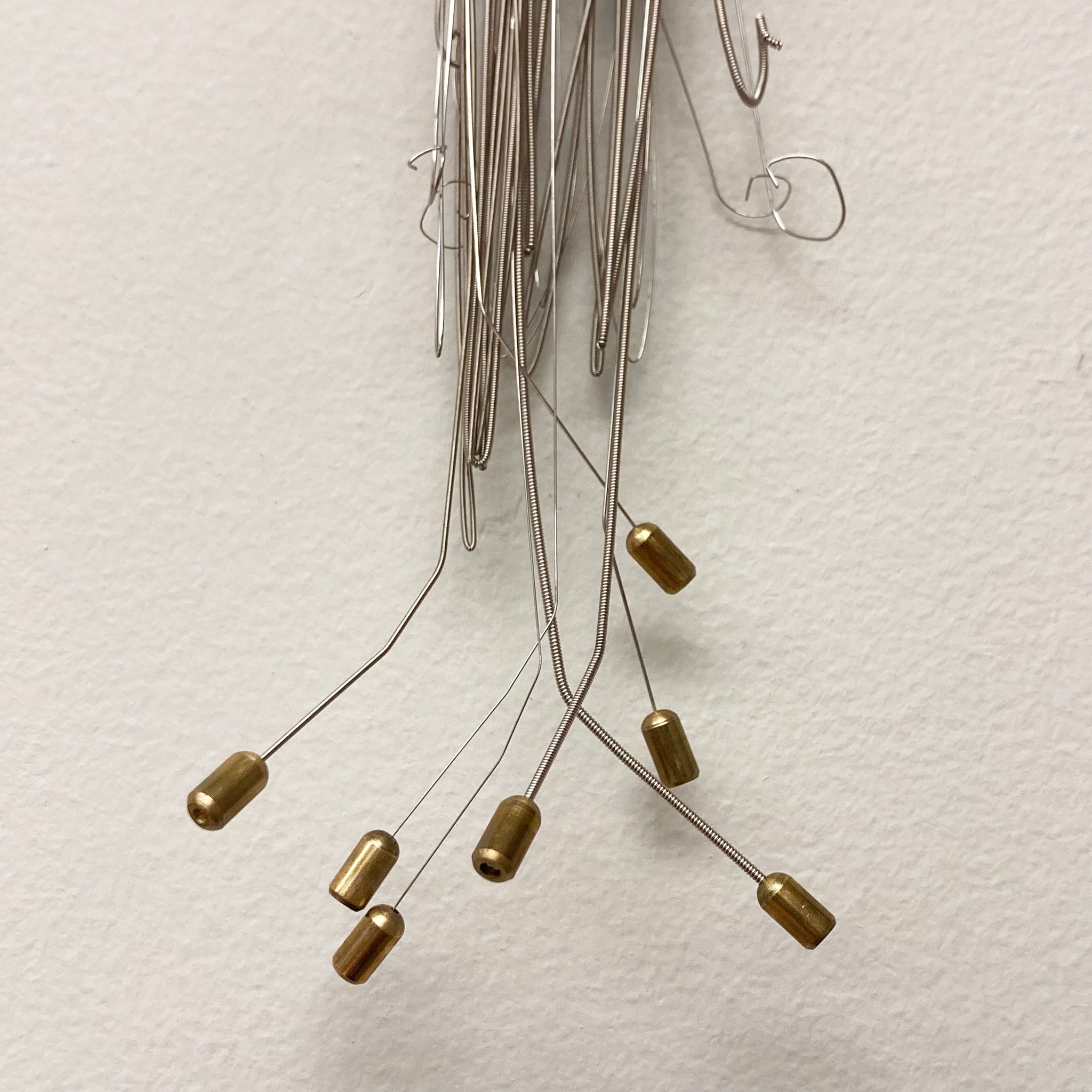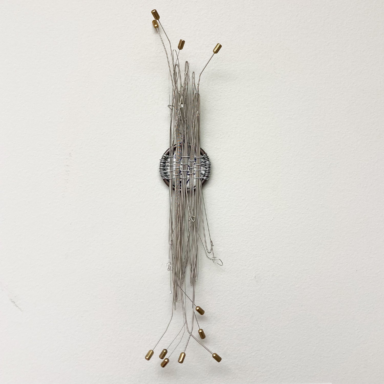 Woven assemblage made with curtain ring, guitar strings, and wire.