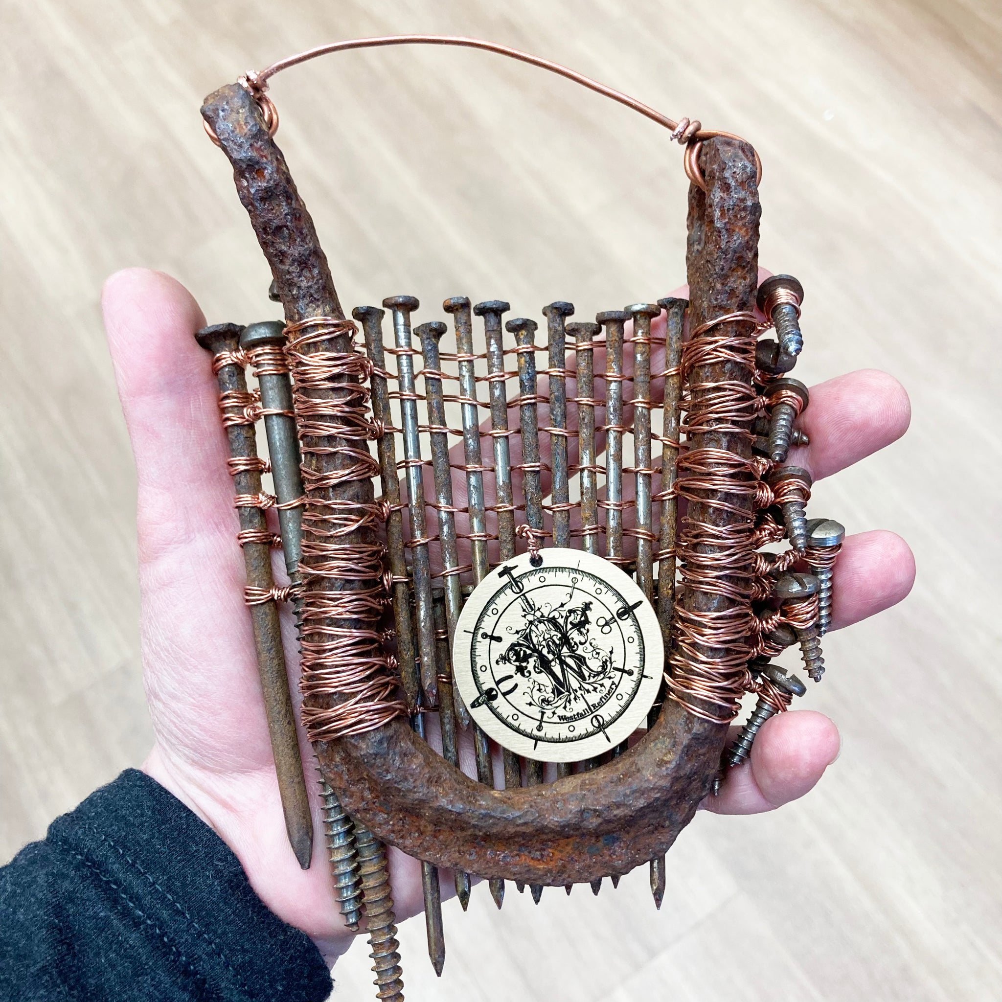 Assemblage made with reclaimed rusty hardware and copper wire.